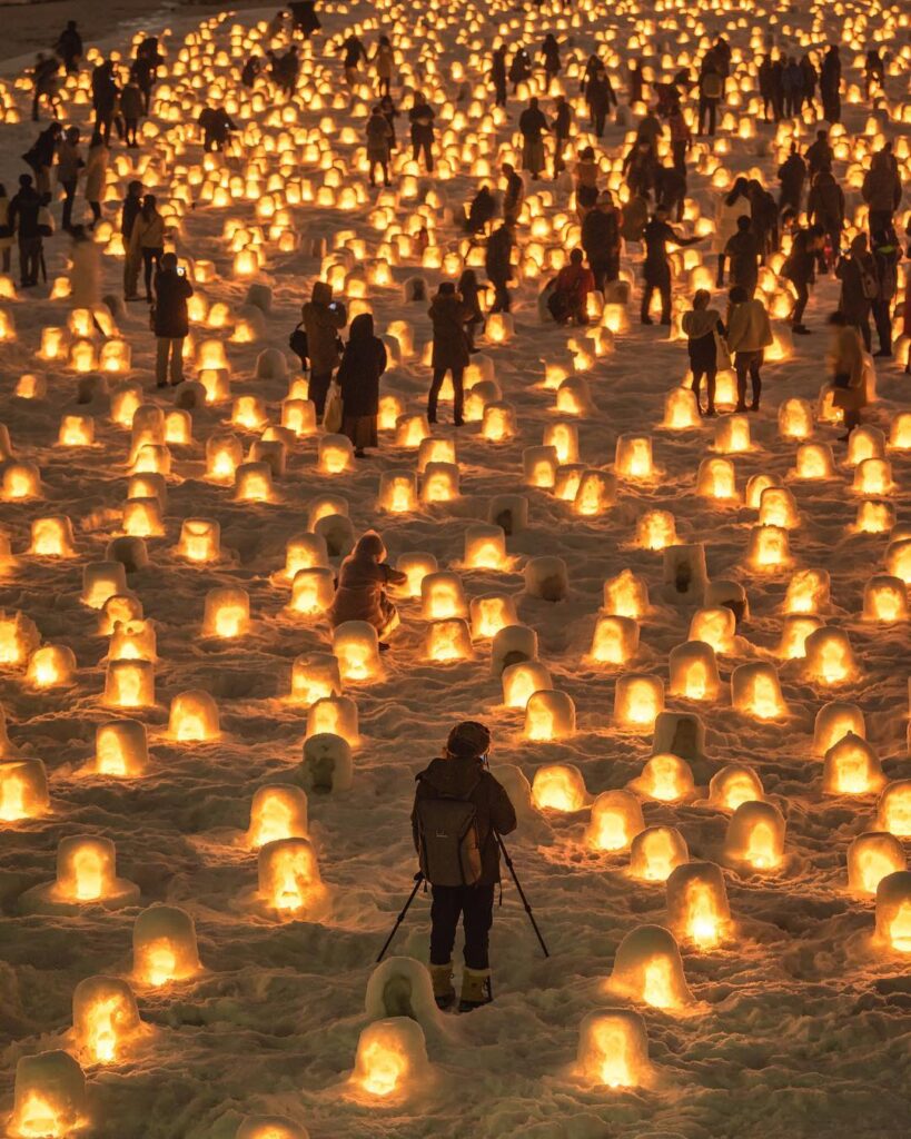 Head on down to the Yokote River, and you’ll see a dazzling display of tiny lights decorating the banks of the river, each one of them a mini-sized kamakura hut!