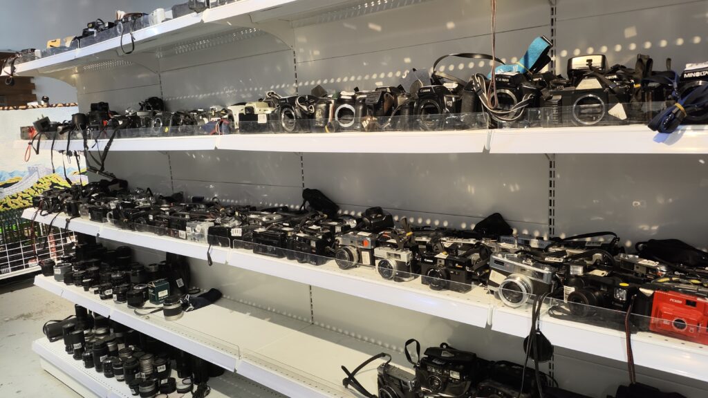 Boxy twin-lens reflex film cameras, beautiful Fuji film cameras with almost-new bodies, toy cameras branded with long dead movie franchises – there’s something for most film (and even digital) camera shutterbugs here.