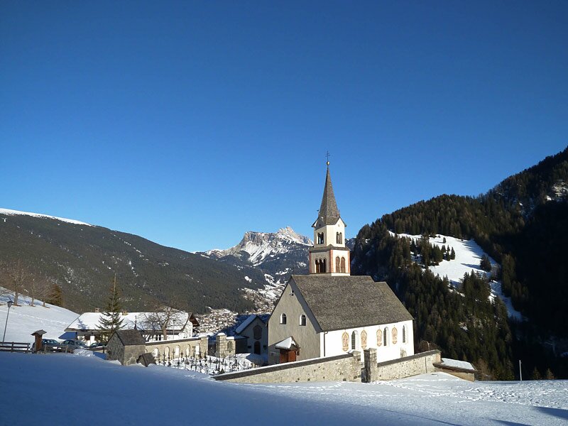 In winter, the green plains transform into pristine snowfields while the white peaks of the Castelrotto, Ortisei and Secada mountains watch over the village.