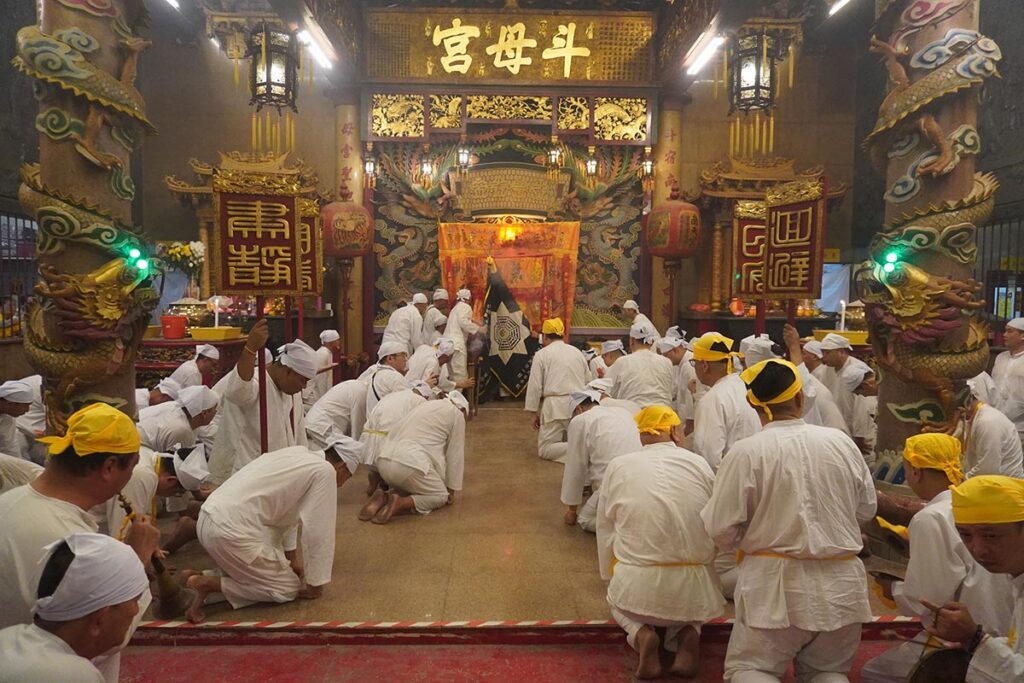 Flocking to temples adorned in gold, devotees dressed in white – the traditional colour of mourning in Chinese cultures – pray, make offerings or participate in ritual mutilations and firewalking.