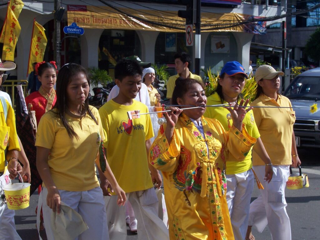 But the most famous aspects of Phuket’s festival are the Ma Song, ardent worshippers who act as spirit mediums through the use of ritual mutilations and piercings.