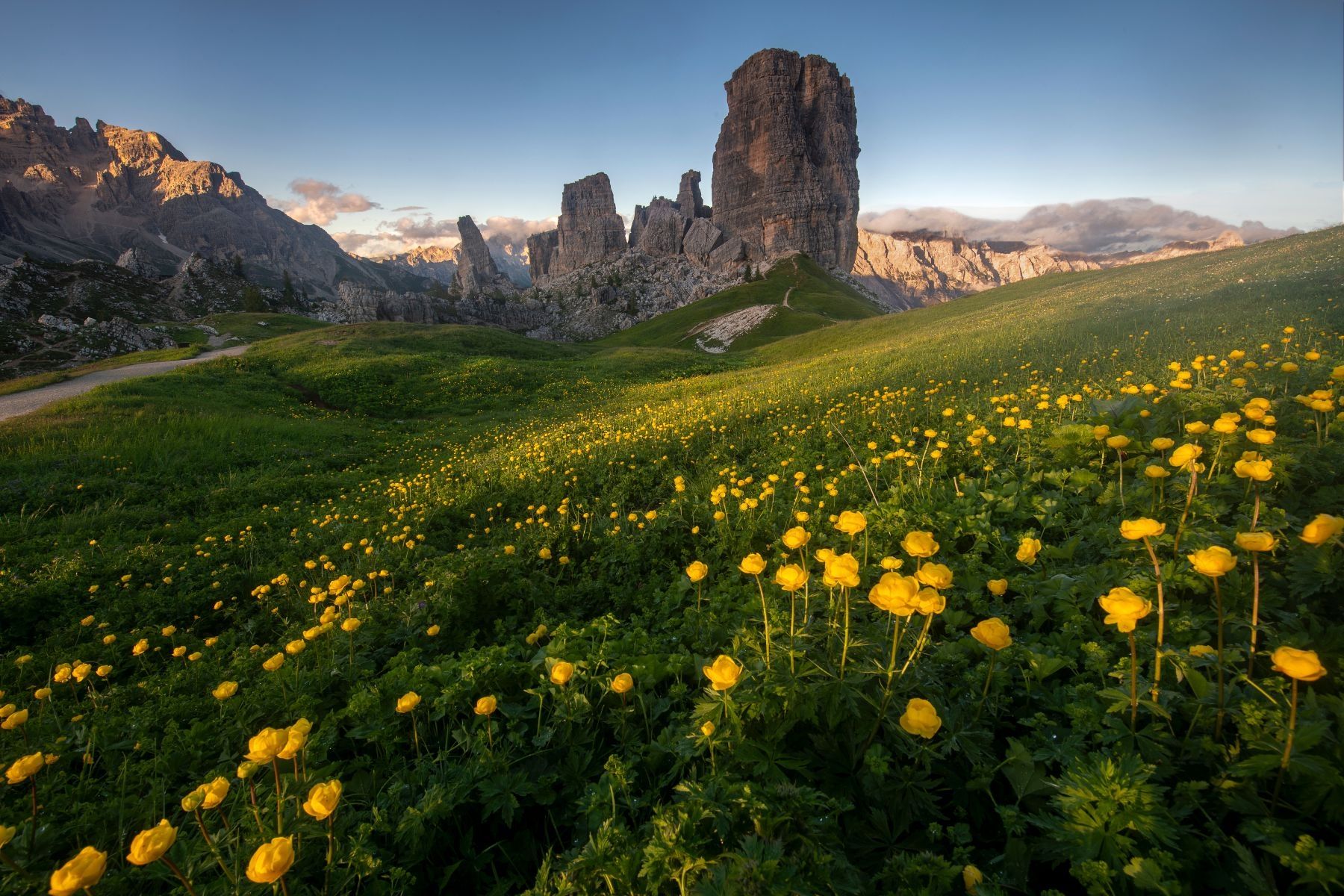 Most of the park’s best wildflower sights can be conveniently found photogenically parked next to soaring geological stars like the solitary monoliths at Cinque Torri Passo Giau or the fortress-like silhouette of Passo Giau.